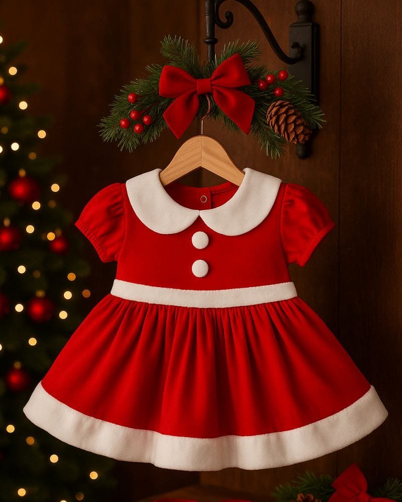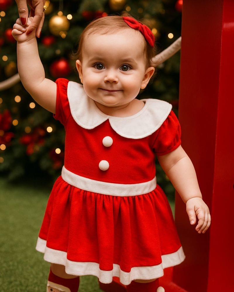 Vestido de Natal Bebê com body embaixo, trazendo muito mais conforto e segurança.